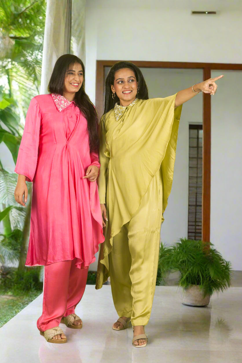 A draped cape and straight‑leg pants set in a fluid, featuring a cinched knot at the waist for gentle shaping. with intricately hand embroidered collar add artisanal elegance. Perfect for festive wear