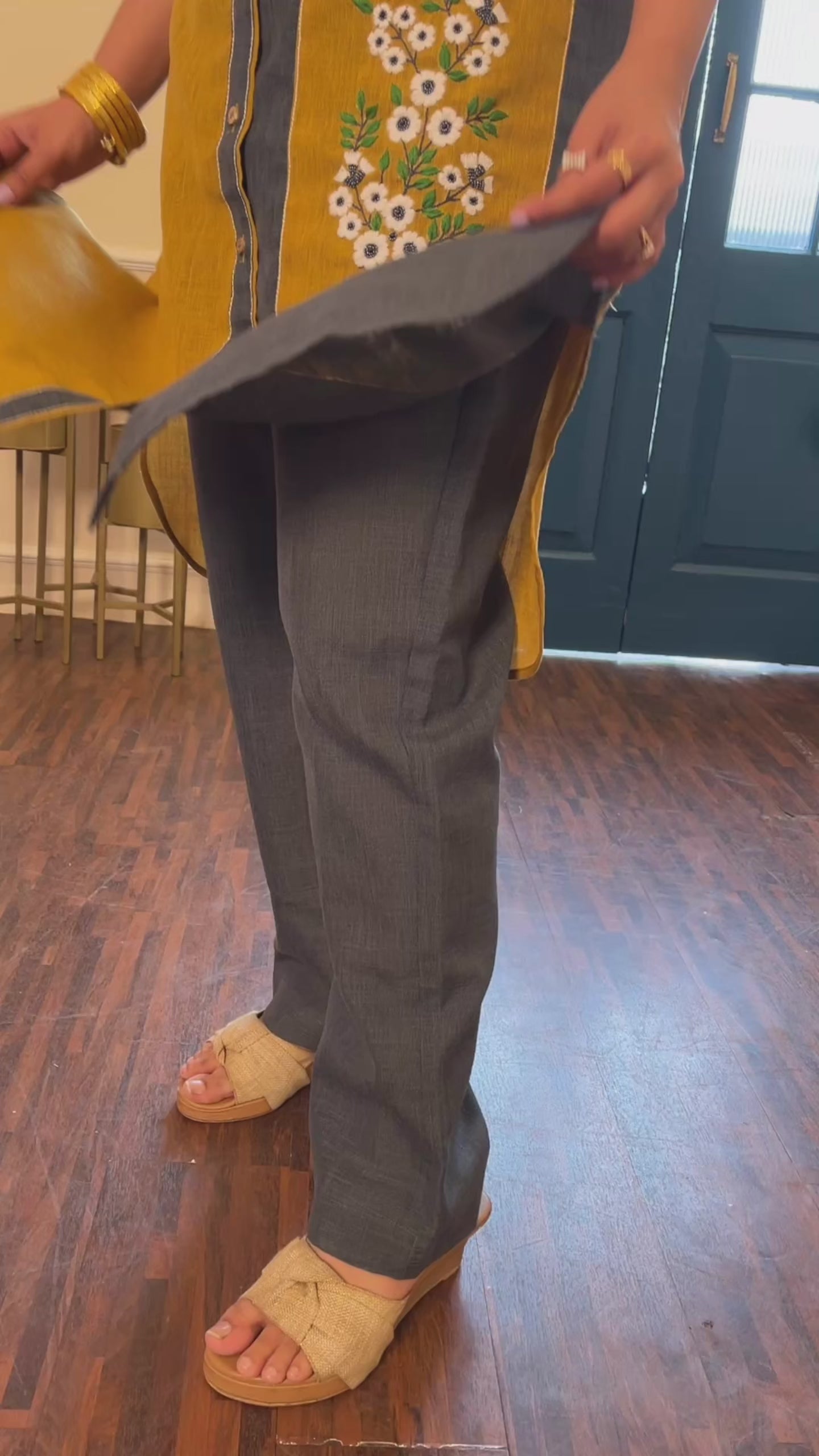 A smart indigo and mustard co-ord set featuring hand l embroidery on a large patch pocket and a stylish half-half panelled front — an effortlessly chic pick for work meetings, creative events, or gallery visits. Style it with block heels, bold hoops, and a structured bag for a modern, polished look.