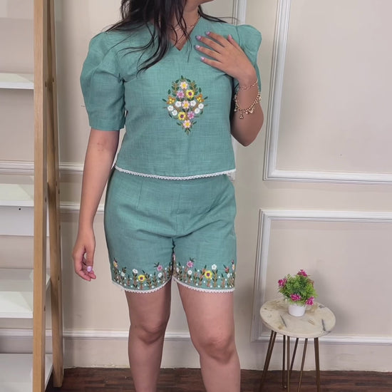 A breezy aqua green co-ord set featuring hand-embroidered floral blooms and delicate lace trims with top & shorts.