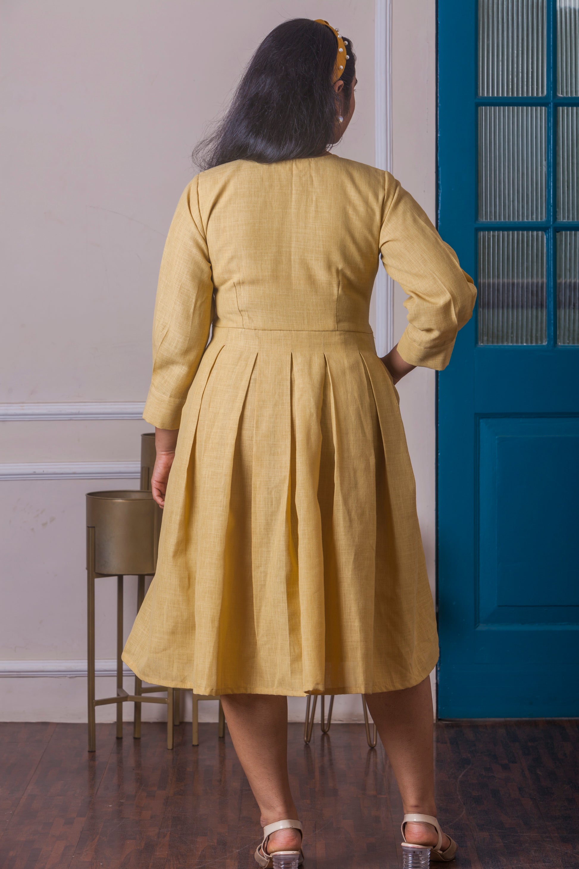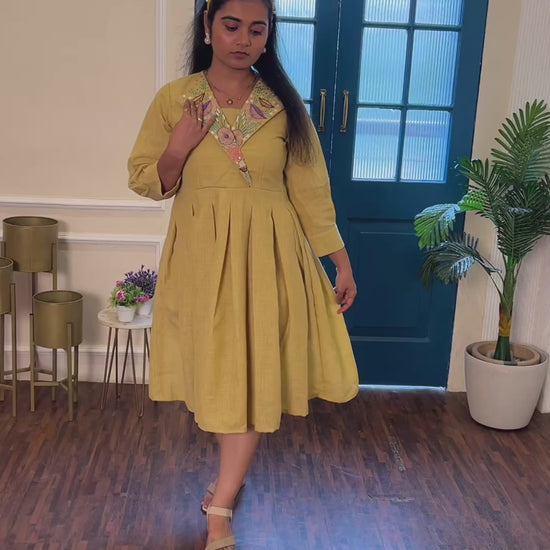 This mustard fit-and-flare dress features a beautifully embroidered V-notch neckline and soft pleats for a flattering, feminine silhouette.
