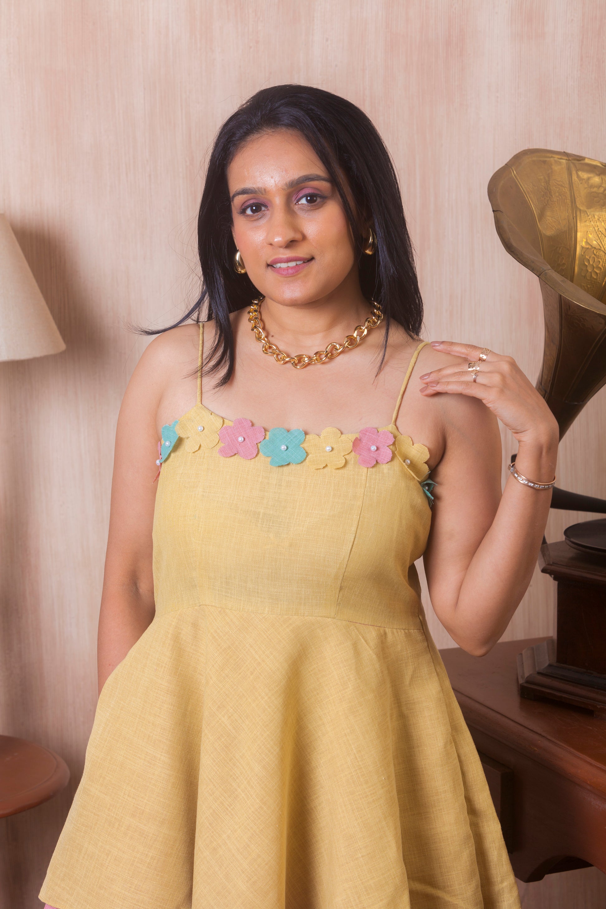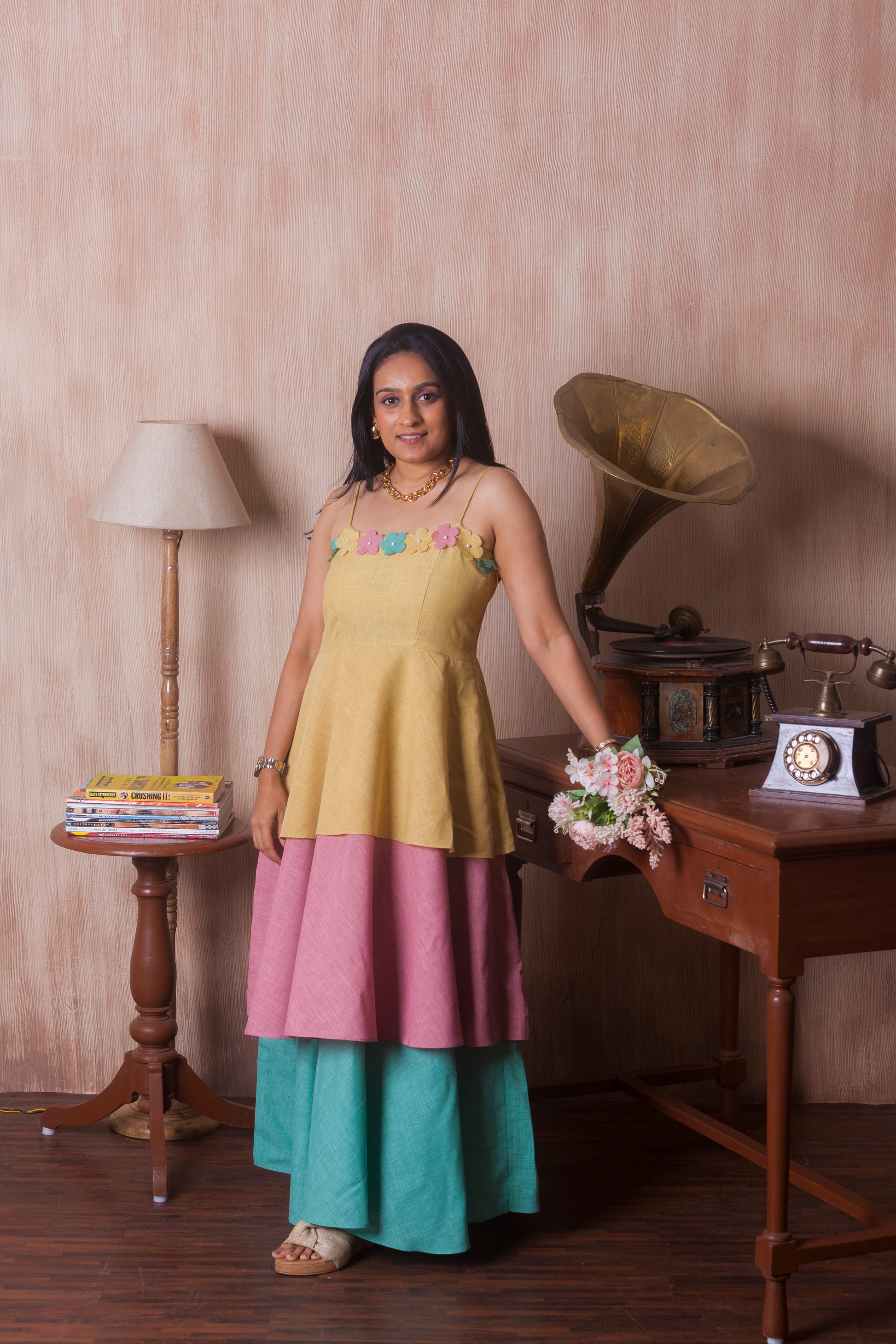 A whimsical layered dress in refreshing pastel tones, featuring a flared yellow bodice with delicate 3D flowers and cascading pink and mint green tiers. Perfect for daytime celebrations, brunches,vacation.