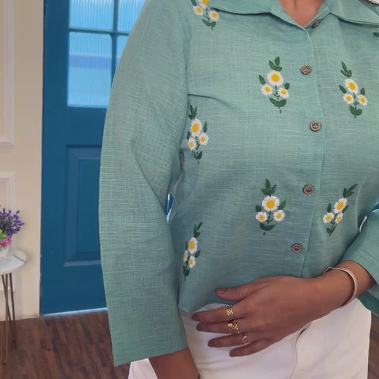Add a playful touch to your wardrobe with this mint green button-down top, adorned with charming daisy embroidery. Its soft fabric and relaxed fit make it a breezy choice for casual chic days.