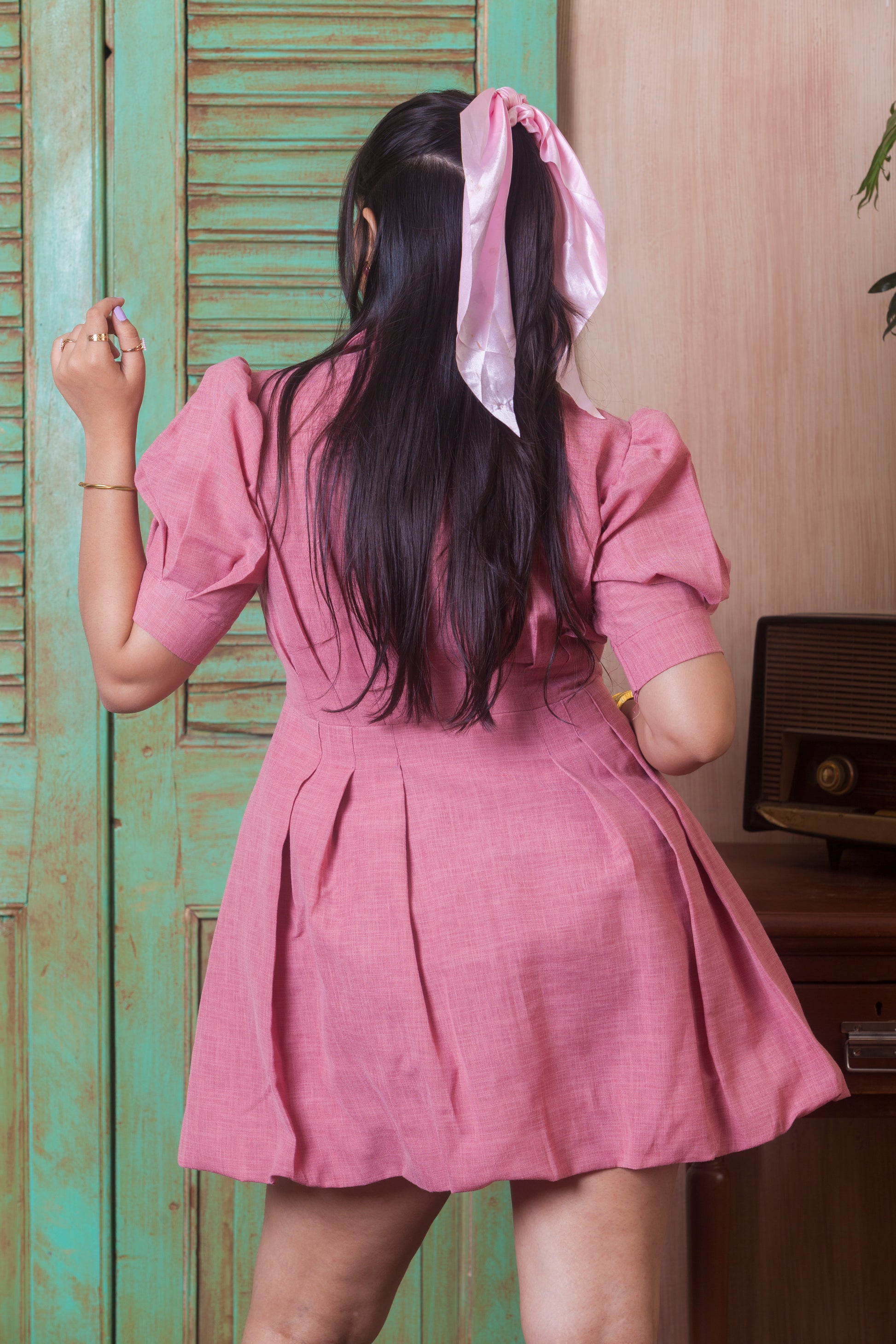 A playful short dress in a dusty rose hue, this piece features puffed sleeves, pleated detailing, and a tailored button-down front that blends vintage charm with youthful flair.