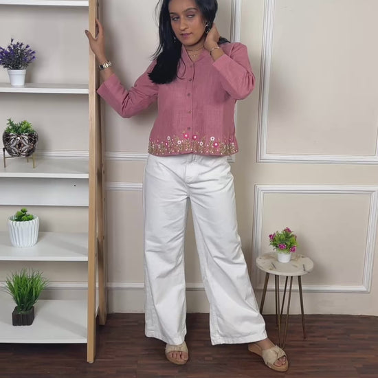 Rose pink hand embroidered linen top