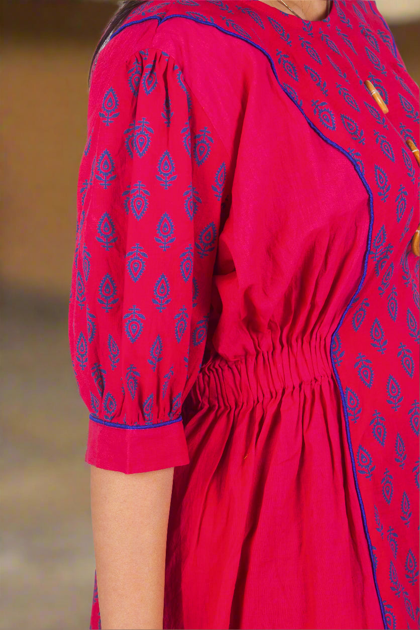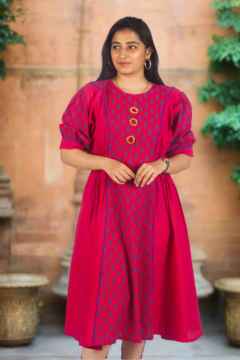 This midi dress with deep blue block-printed center panel.The puff sleeves, gathered waist, and oversized circular buttons add a fun and contemporary twist.Perfect for daytime events where you want to look effortlessly chic with a cultural nod.