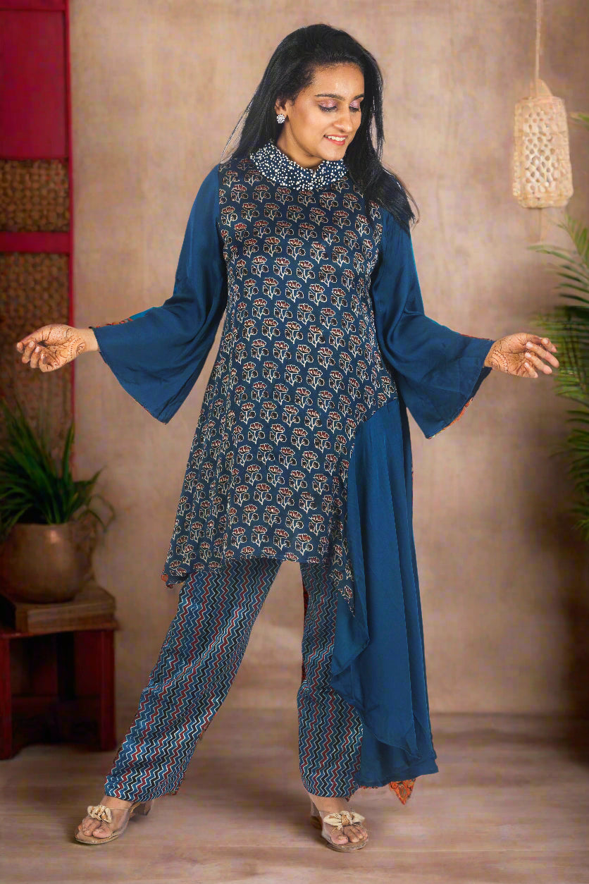 A blue asymmetric tunic with bell sleeves and a high, beaded handwork collar.Paired with zigzag-patterned straight-leg pants in coordinating tones. Perfect for festive or cultural gatherings.